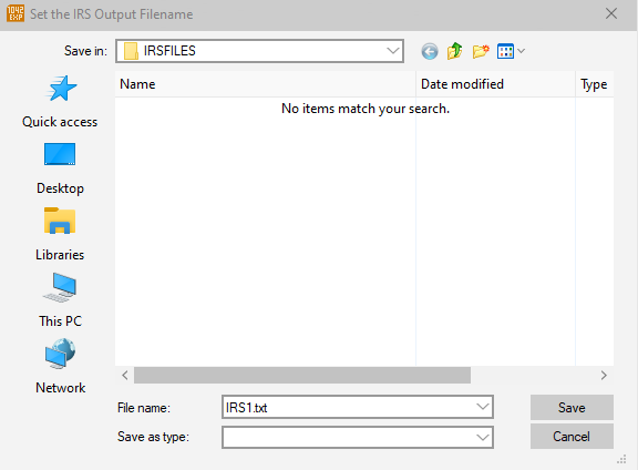 - A window will populate where the User can enter the file name and save the IRS1.txt file. (as seen below)