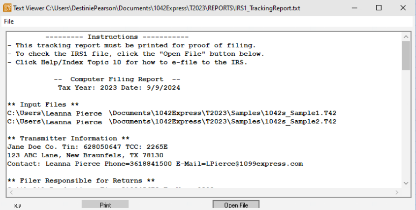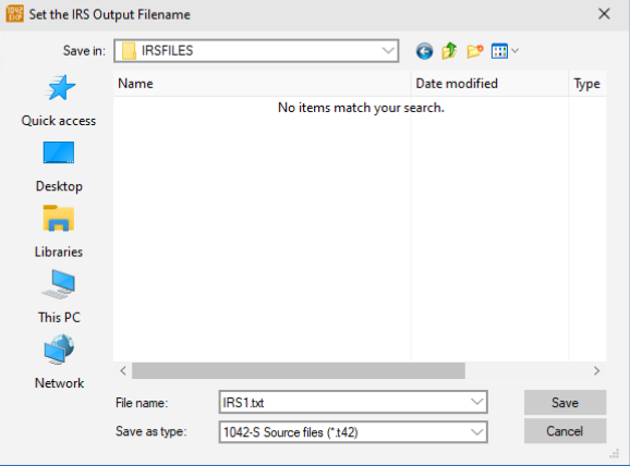 • The default folder for both the IRS1.txt / IRS1.zip file will be located here: This PC / User / Documents / 1042Express / T20XX / IRSFILES
