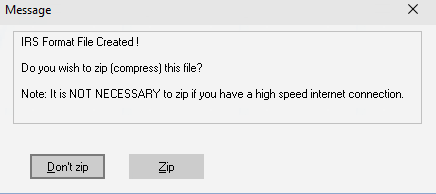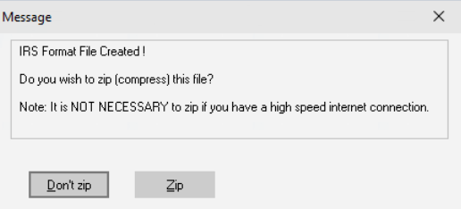 • A Message box will then populate asking if the User will want to "Zip" the IRS1.txt file.